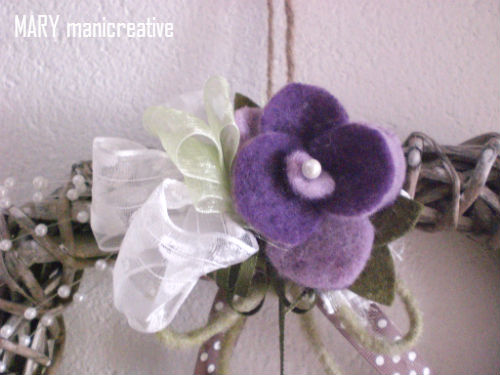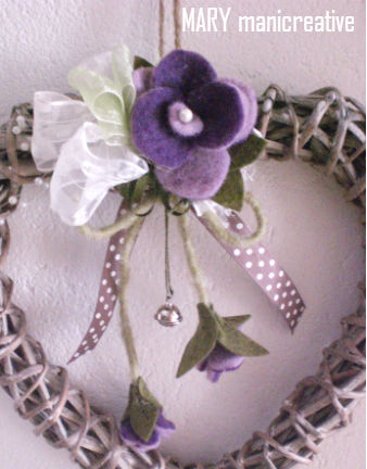 questa invece è la versione in tinta naturale con fiori viola tono su tono, creati con un feltro particolare bicolore, da una parte scuro e dall’altra chiaro. Qualche dettaglio rende il cuore un po’ più particolare e di sicuro un pezzo unico!