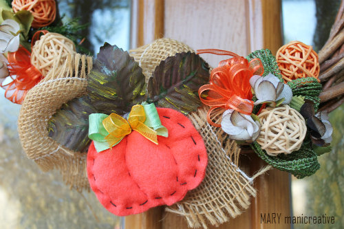 Questa è la mia ghirlanda fuoriporta in vimini intrecciato con una zucchetta in pannolenci che fa da protagonista e accompagnata da palline in vimini, fiorellini in stoffa e un qualche rametto di verde.