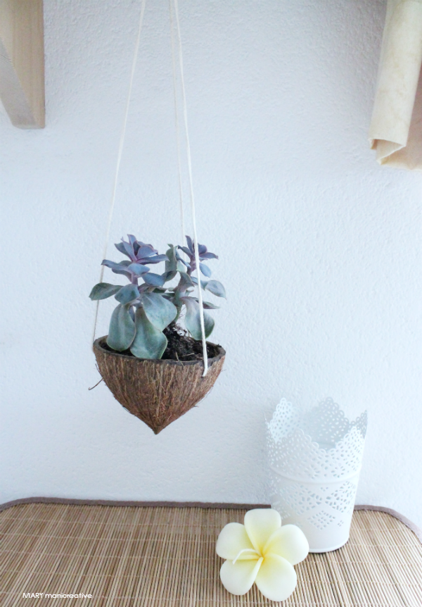 Ultimamente sul web vengono proposte molte composizioni di piante “sospese”, così ho creato questo vaso con il guscio del cocco per ospitare una piccola piantina (non solo piante grasse!).