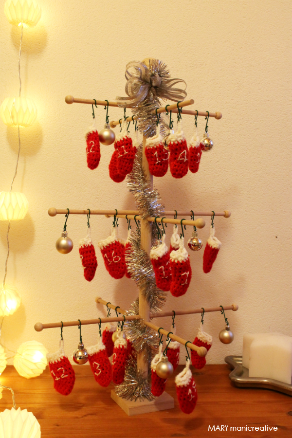 Ho appeso poi tutte le calzette su un albero in legno già pronto da montare, tipo questo, scelta ideale avendo il tempo contato. Ho aggiunto qualche decorazione per renderlo ancora più simile ad un albero di Natale e ora è pronto in salotto per lasciare che mia figlia scopra giorno per giorno cosa contengono le calze.