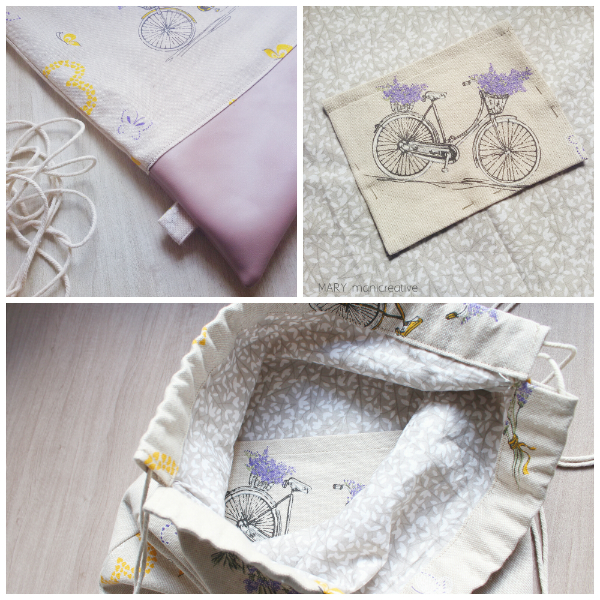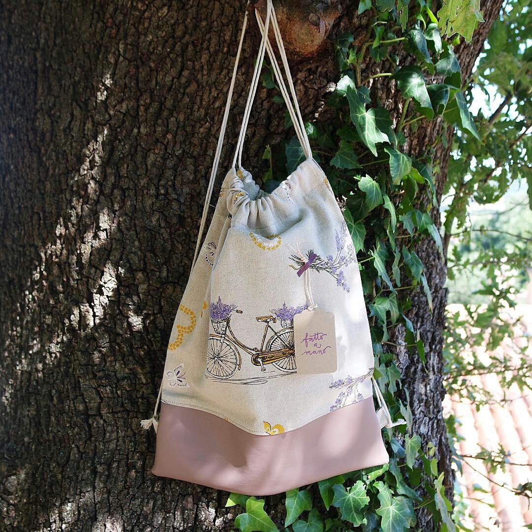 Ecco che è nata una sacca zaino dallo stile decisamente romantico. Per l’esterno ho usato la stoffa con la stampa delle bici e per il fondo il ritaglio di pelle così da dargli maggior consistenza. L’interno è foderato con una stoffa in cotone fantasia (che trovo bellissima!) e ho applicato una piccola tasca interna che è sempre comoda per riporre piccoli oggetti che altrimenti andrebbero sul fondo disperdendosi tra mille altre cose.