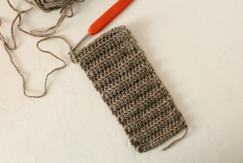 Piegare a metà il lavoro tendendo il filo di inizio del lavoro sia dietro e sulla parte sinistra. Unire i due lati corti con 14 mbsscdr puntando l’uncinetto nell’asola dietro alla prima catenella e in quella davanti della seconda fila del lato opposto