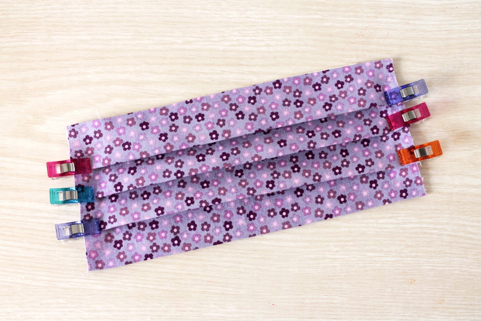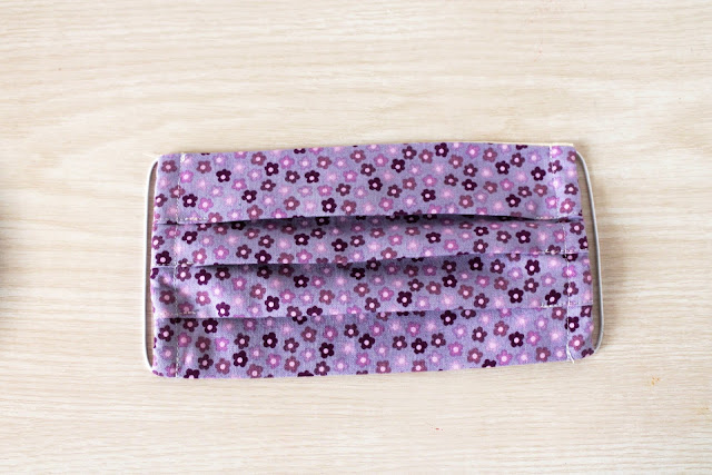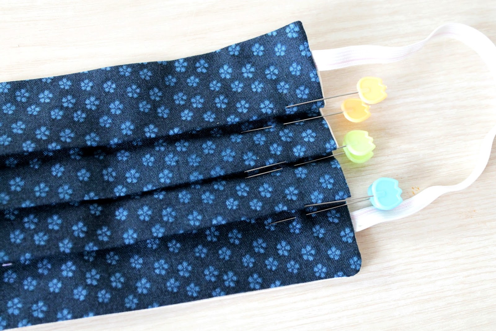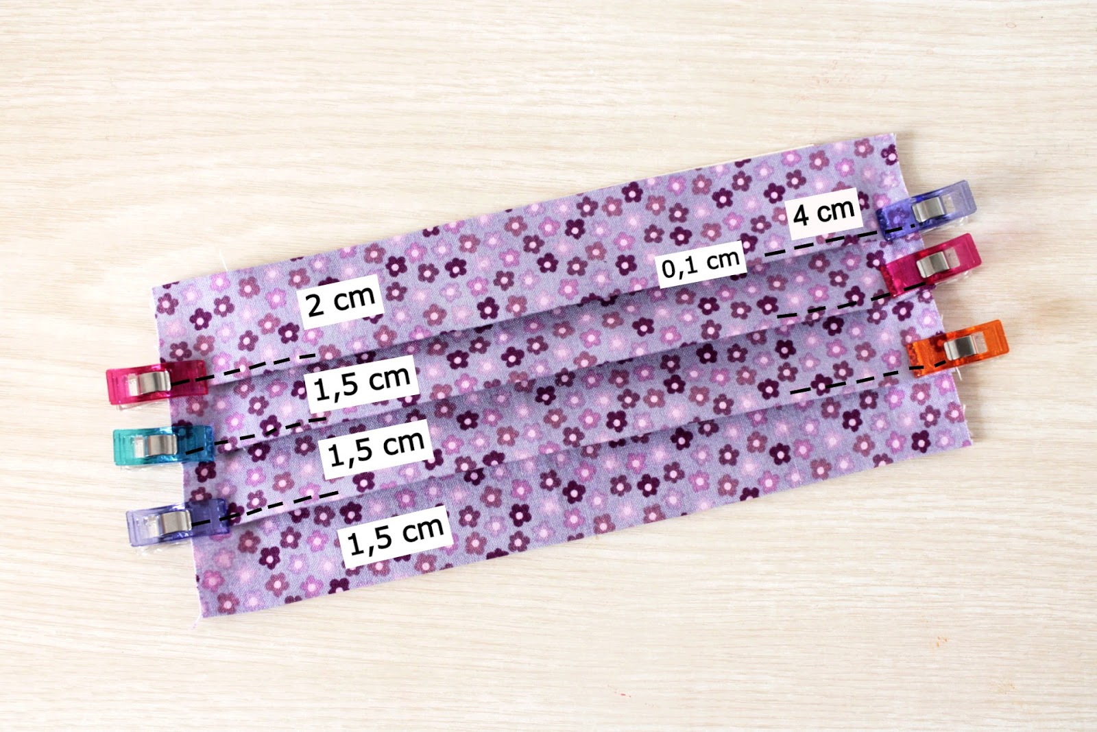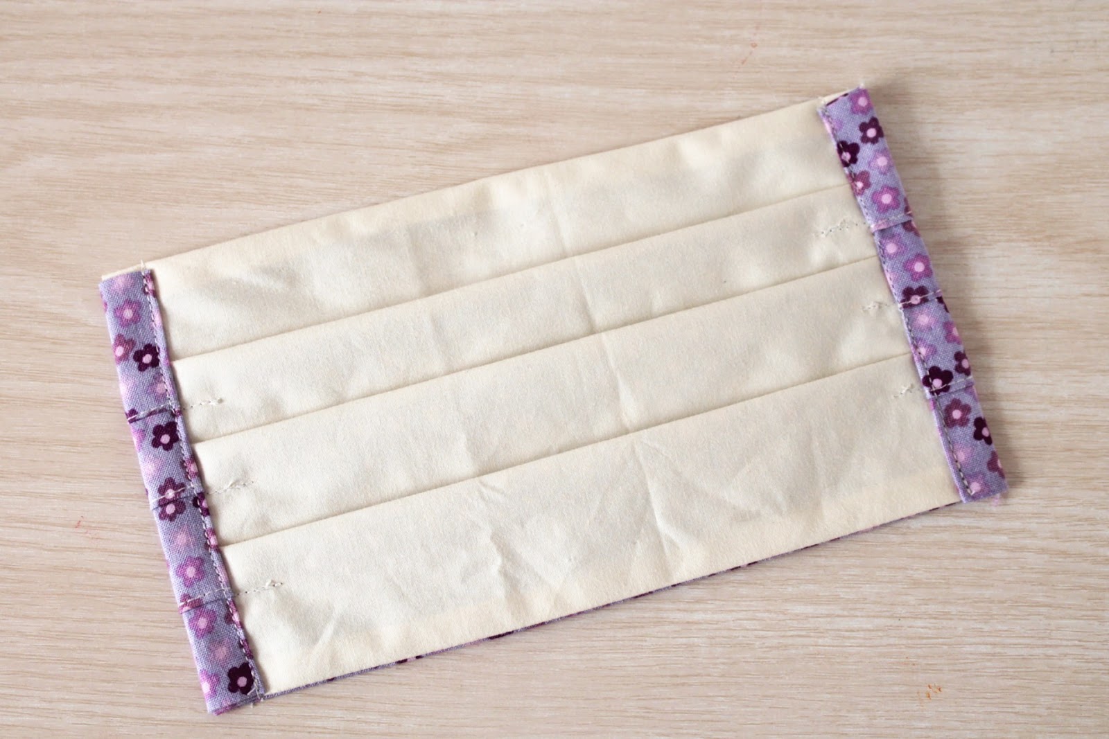 Piegate i bordi della mascherina verso l’interno di 1 cm e poi piega ancora una volta all’interno di 1 cm. Questo servirà per creare la “tasca” dove passare l’elastico.