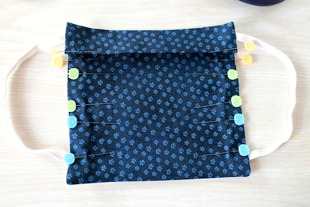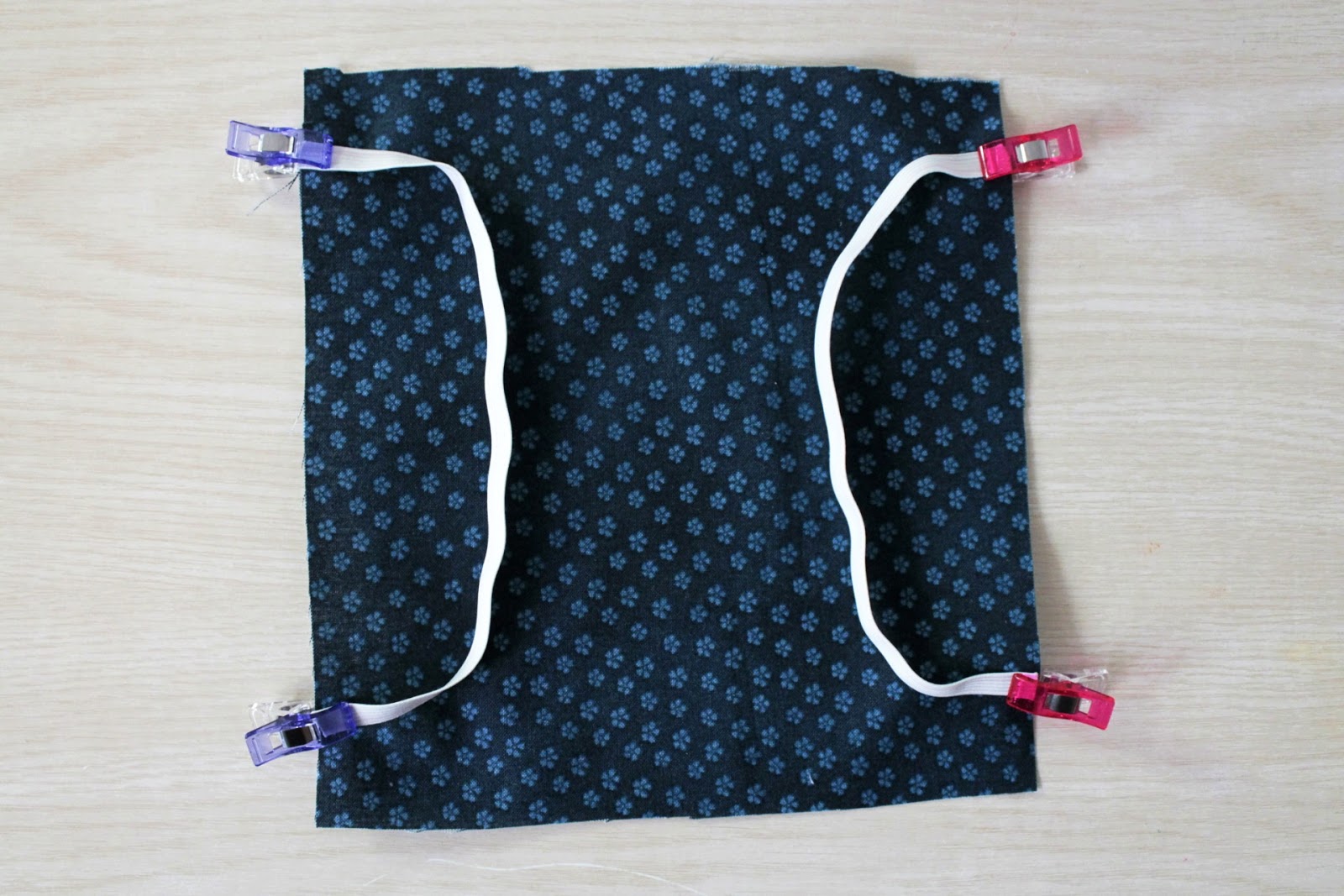 Posizionate i capi di ogni elastico a circa 2 cm dal bordo della stoffa fantasia lungo il lato più lungo. Fermate l’elastico con l’aiuto delle mollette. Posizionate sopra alla stoffa, dritto con dritto, il pezzo di stoffa tinta unita e appuntate lungo il perimetro con gli spilli.
