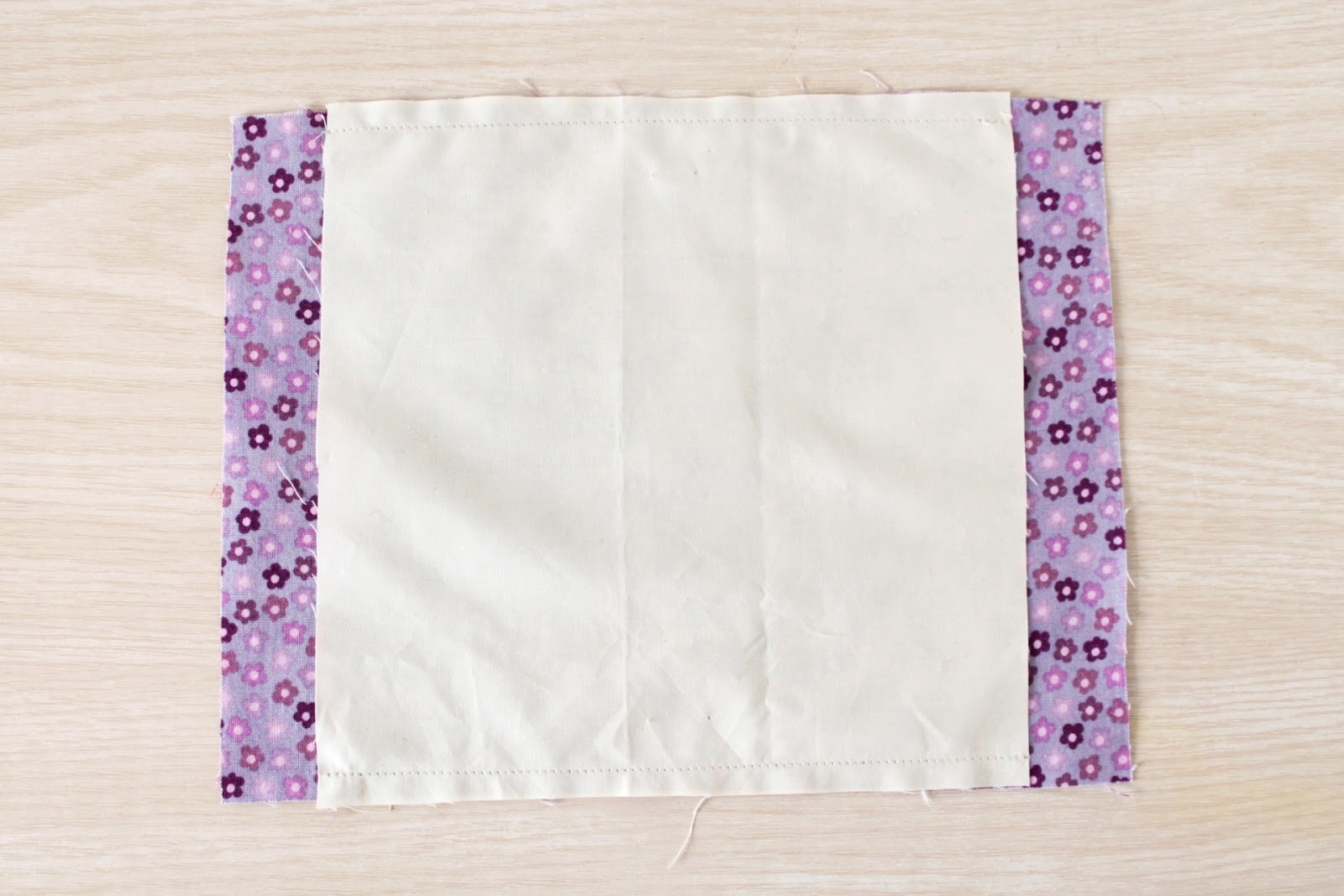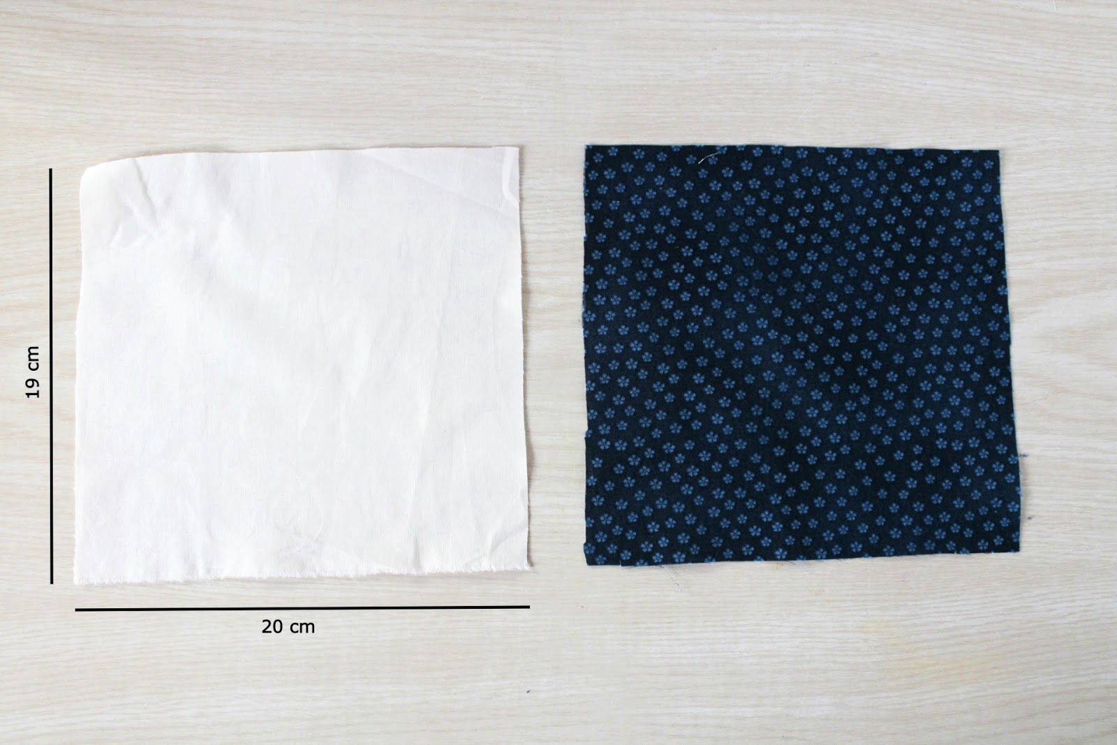 Tagliate due rettangoli di 19cm x 20cm dalla stoffa tinta unita e dalla stoffa fantasia.