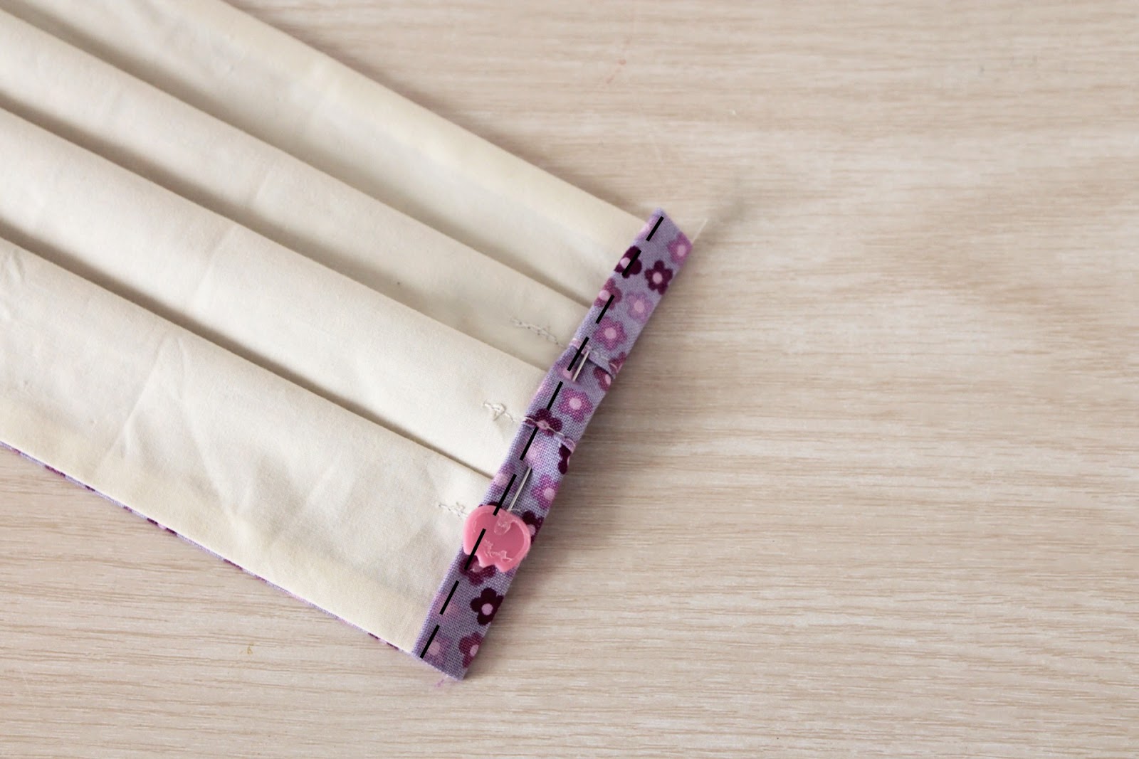 Ora fate 3 pieghe orizzontali a punta con gli spilli. Piegate a fisarmonica la stoffa seguendo lo schema nell’immagine qui sotto. Potete fermare le pieghe usando gli spilli o le mollettine.