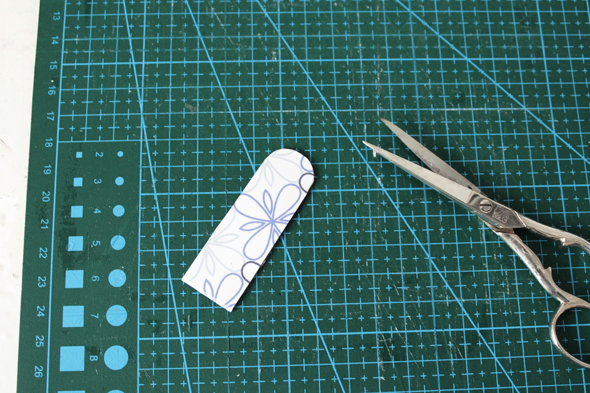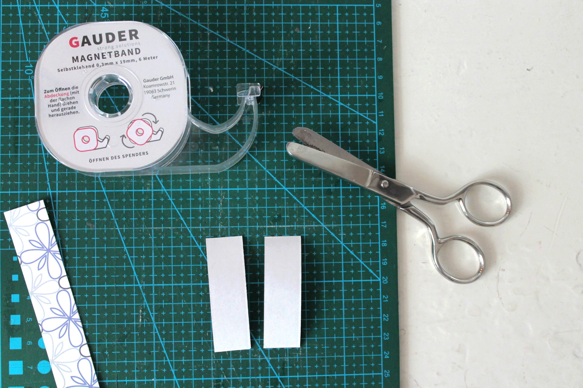 Una volta fissato il nastro magnetico chiudi a metà la strisci di carta e con l’aiuto di una forbice ritaglia il lato corto aperto dando una forma ricurva.