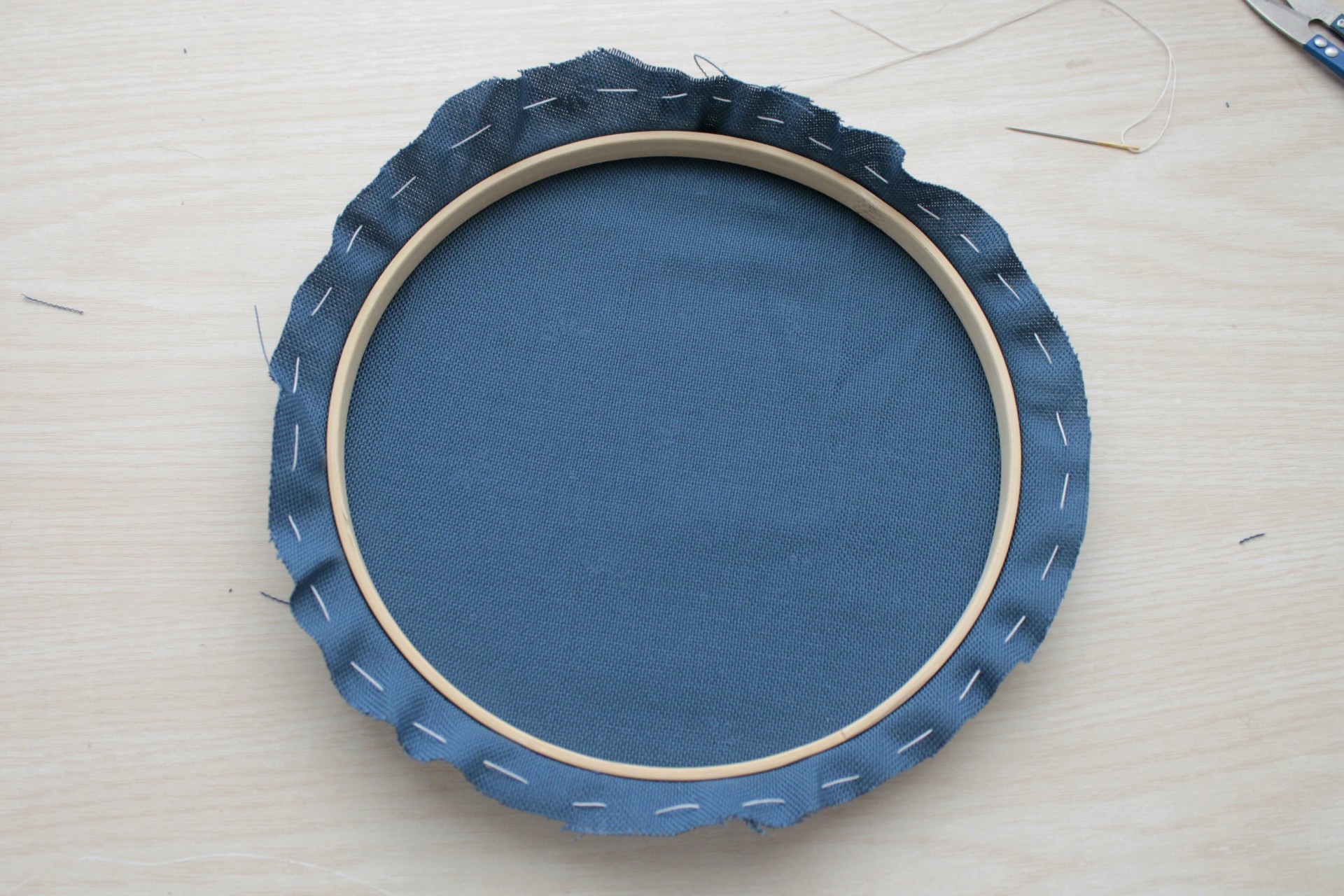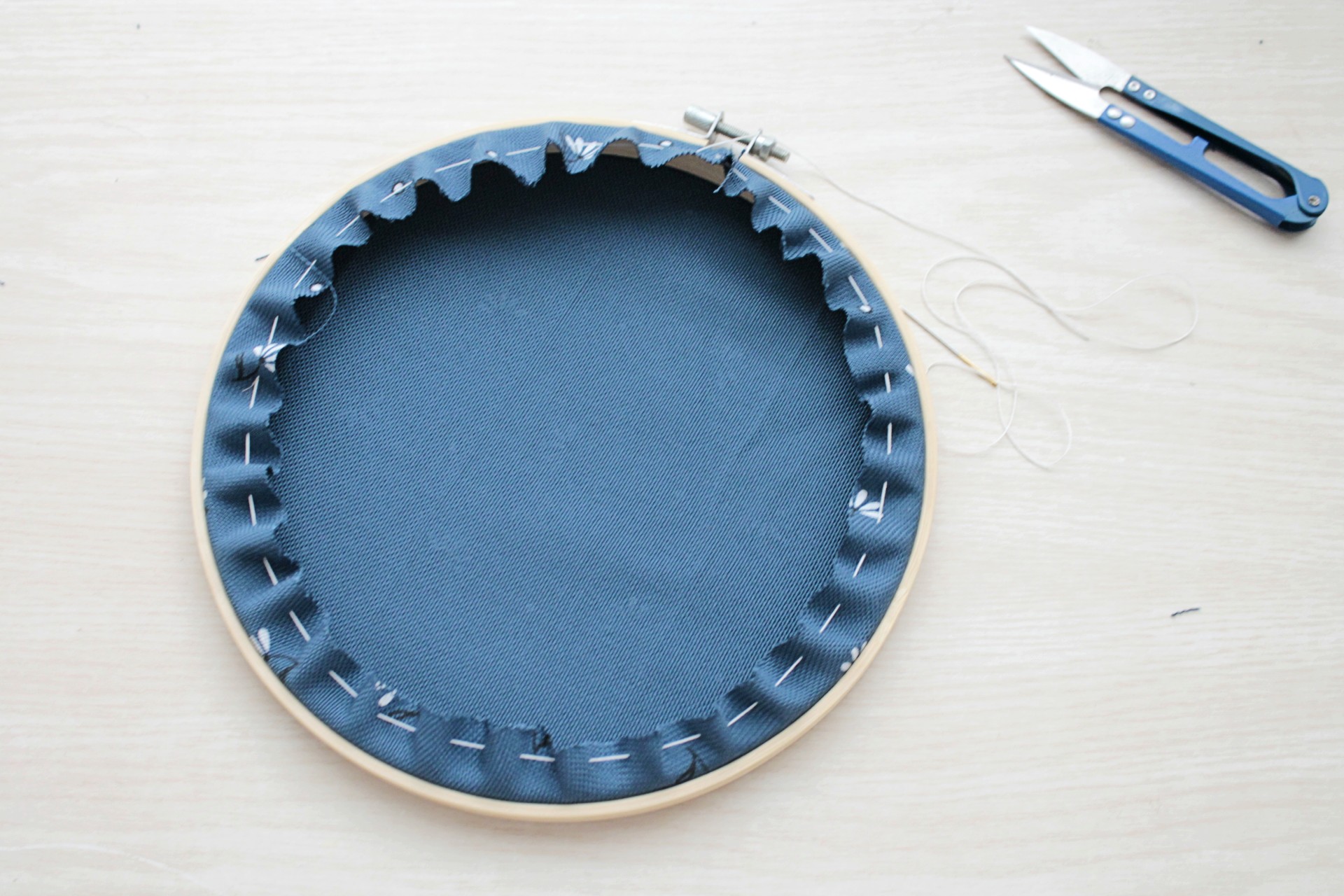 Rigira il telaio sul rovescio, tira il filo della filza per arricciare la stoffa e fissa il filo con un punto e un paio di nodini.