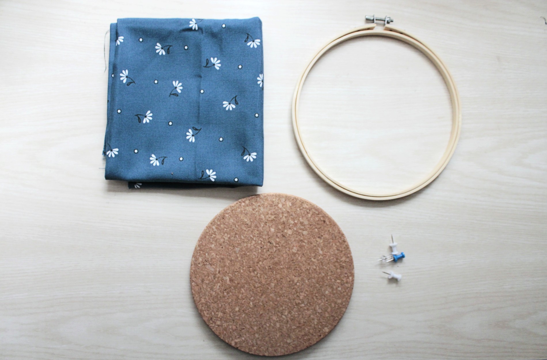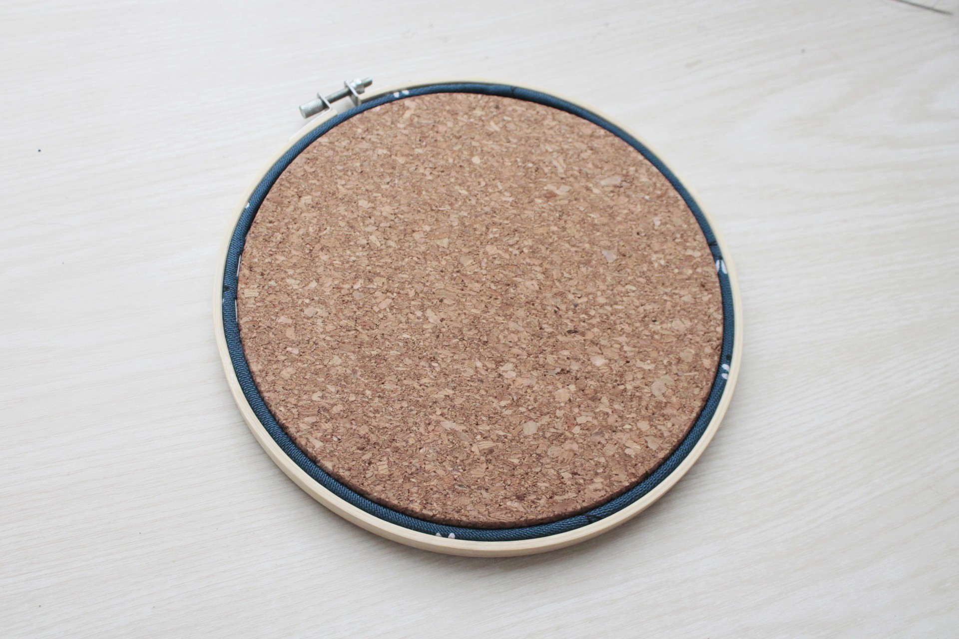 Ora prendi il disco di sughero e infilalo sul retro del telaio incastrandolo bene e risvoltando all’interno la stoffa. Puoi usare un po’ di colla sui bordi se non dovesse rimanere fermo.
