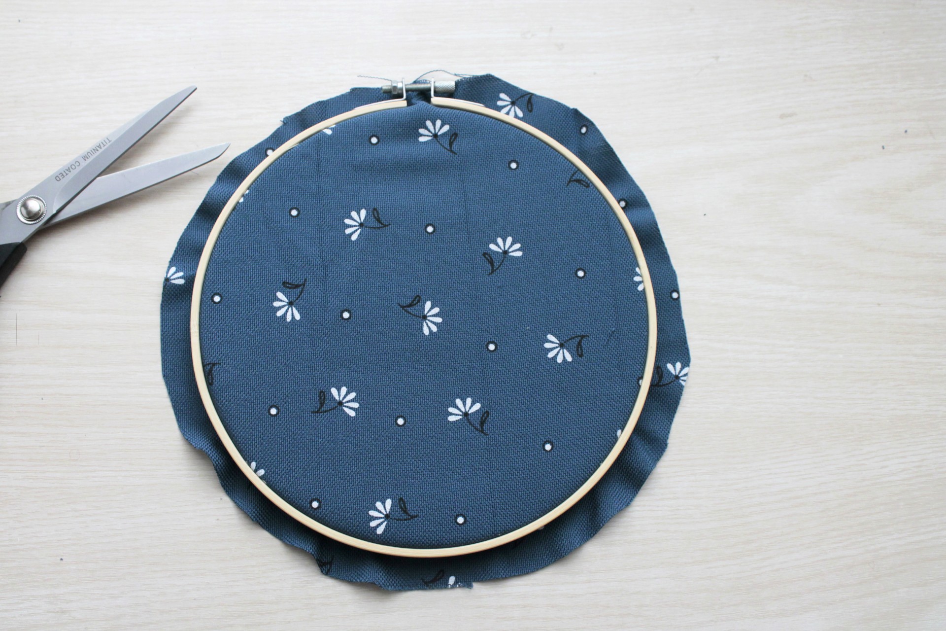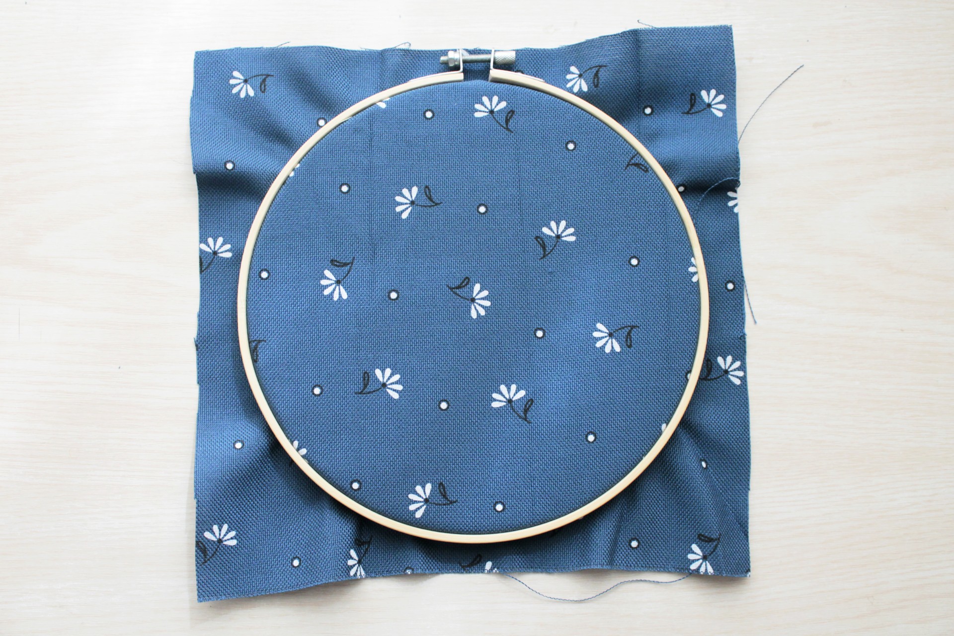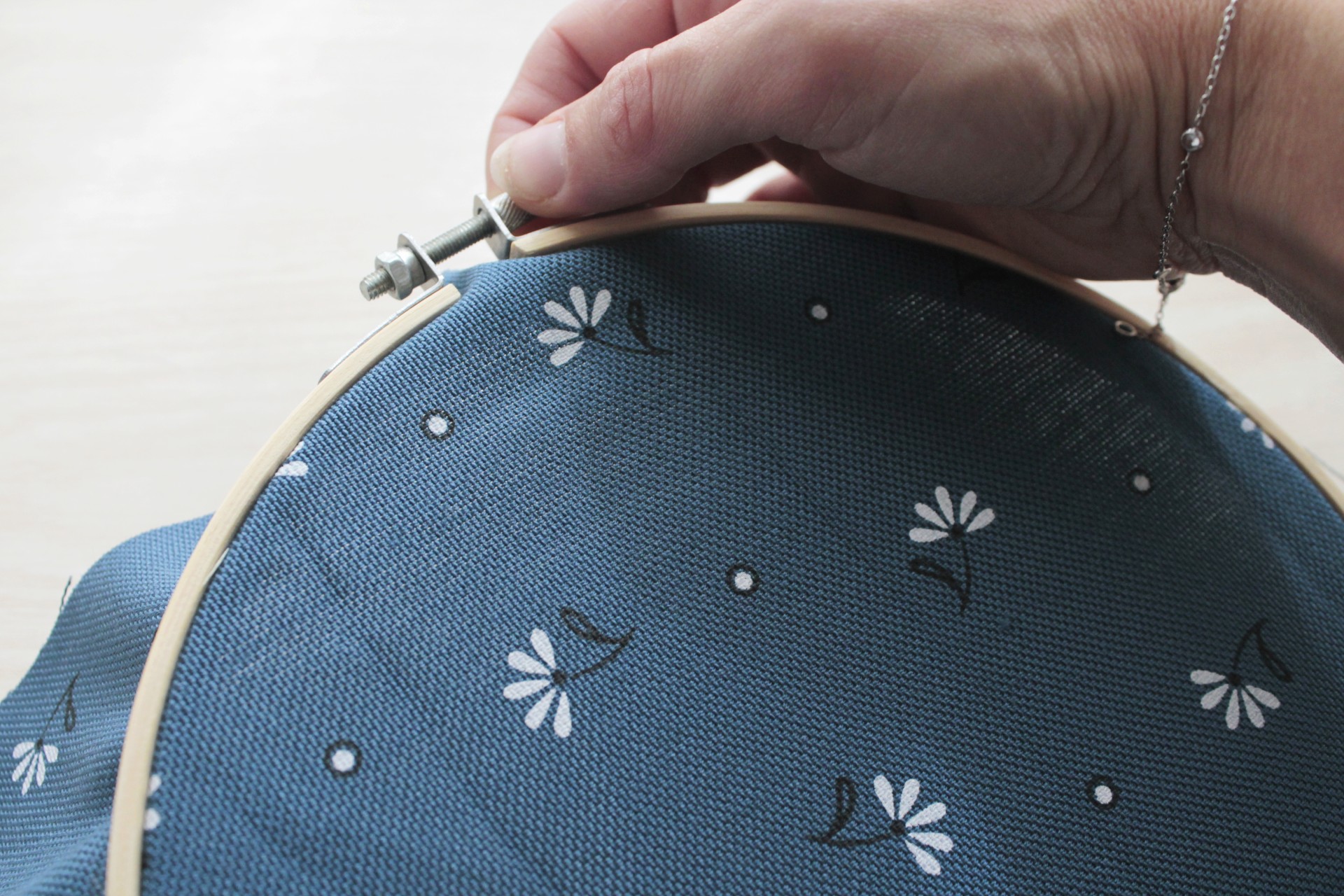 Ora posiziona la stoffa nel telaio: appoggia la parte interna del telaio sul piano, poi metti la stoffa e infine metti sopra la parte esterna del telaio.