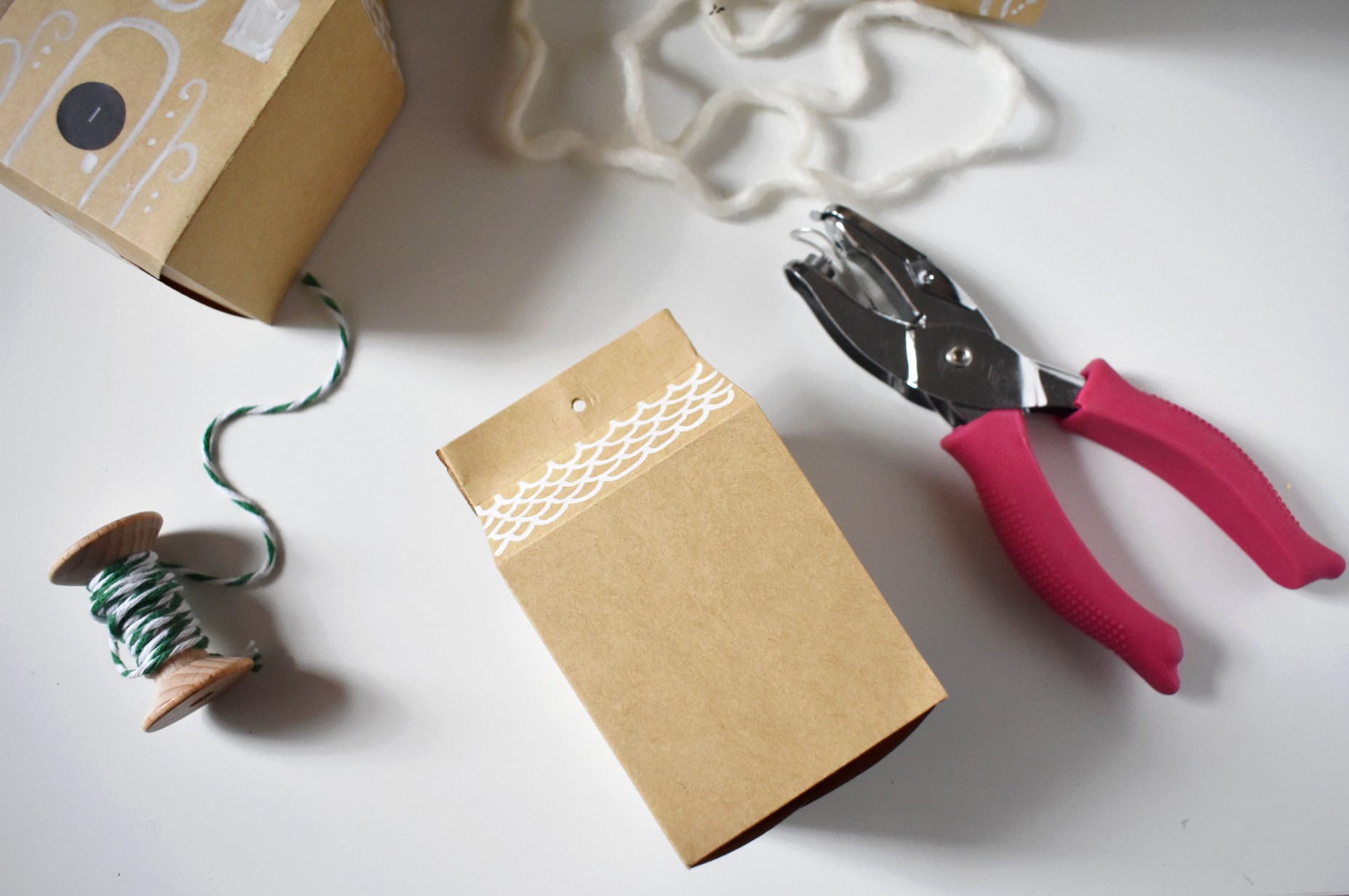 Infine chiudi la parte alta della scatola, quella del tetto, facendo un foro con la punzonatrice e fissando il tutto con un nastrino o cordoncino.